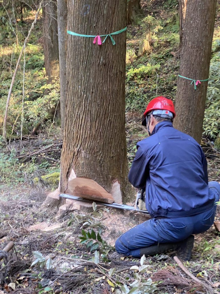 一気にチェンソーの刃を入れて、伐採します。